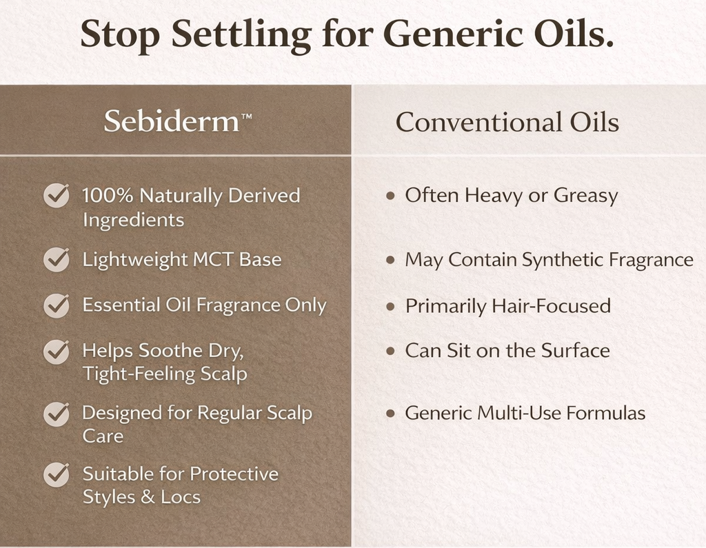 Unlike many generic oils, our formula uses MCT oil and carefully selected essential oils to support scalp balance without heavy additives, synthetic fragrance, or unnecessary fillers.